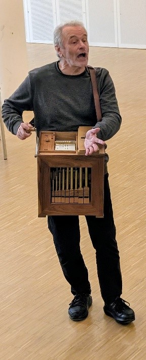 Zu Beginn stellte sich Herr Pfaff vor und erzählte kurz, warum er sich so intensiv mit Balladen beschäftigt. Bevor es losging, erklärte er kurz die Merkmale einer Ballade und zeigte uns die Requisiten, die er für den Vortrag brauchte: Knochen, einen Dolch, Münzen, Horn und eine Drehorgel. Neben den sehr bekannten Balladen „John Maynard“ (Fontane) oder auch „Der Zauberlehrling“ (Goethe) trug Herr Pfaff auch eigene Balladen vor, wie zum Beispiel seine Ballade „Widerstand“. Auch Moritaten – eine Form besonders gruseliger Balladen, die oft von Mord handeln – stellte Herr Pfaff uns vor, die er sogar mit der Drehorgel gesungen hat. Es war zwischendurch auch sehr interaktiv, denn man konnte auch durch Lösen eines kleinen Rätsels eine Tafel Schokolade gewinnen. Zwischen den Balladen konnte man immer Fragen stellen, so dass man auch viele Informationen zu den Balladen bekam.