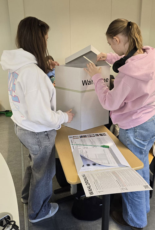 Organisiert und durchgeführt wurde die Wahl von den Klassen 9a und 9b, die sich intensiv mit den Abläufen einer echten Wahl beschäftigten und für einen reibungslosen Ablauf sorgten. Die Auszählung der Stimmen übernahm die Klasse 10d, die mit großer Sorgfalt das Wahlergebnis ermittelte.